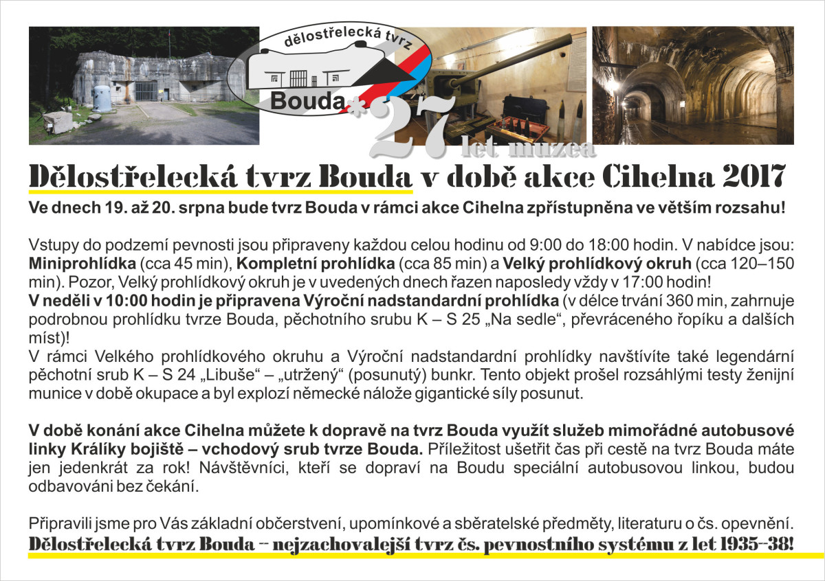 Níže pod tímto článkem je uvedený rozpis autobusové dopravy na dělostřeleckou tvrz Bouda, podrobný program celé akce Cihelna 2017, podrobnosti ohledně možnosti jízdy v obrněné technice, prezentace limitované edice upomínkových předmětů apod.
