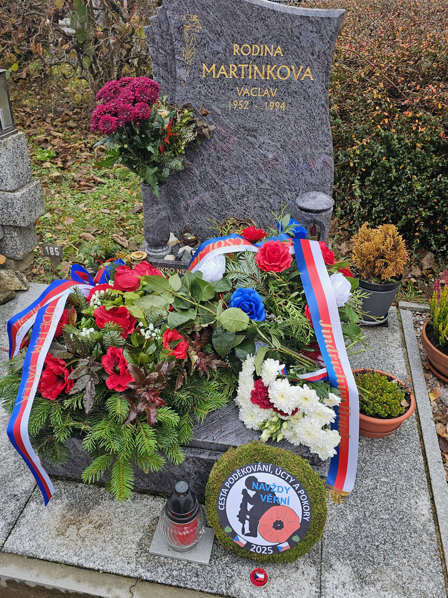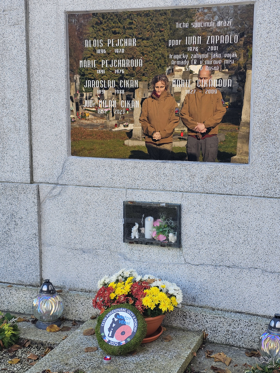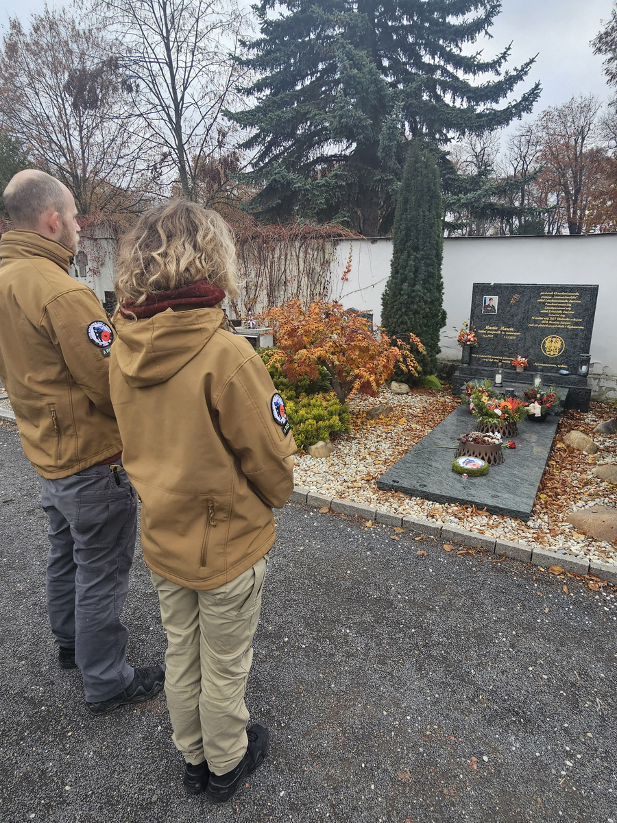 Na hřbitově v Choustníku odpočívá major Ing. Rostislav Samec. Kraj je nasycený vlhkostí, listí tmavne v trávě, vzduch je chladný. Na jeho náhrobku poutníci čtou slova, která v deštivém dni zní ještě hlouběji: „Jediné, co bude důležité, až odejdeme, budou stopy lásky, které tu po nás zůstanou.“ Nad těmito slovy se rozhostí ticho. A možná právě v něm je celá podstata této cesty. Poutníci přikládají vlaječku, svíčku a poutní věneček.