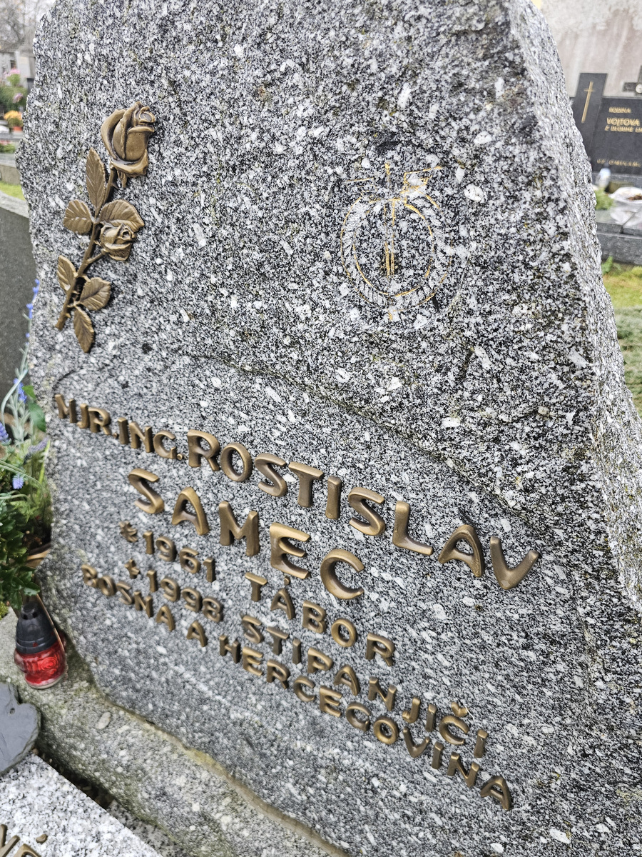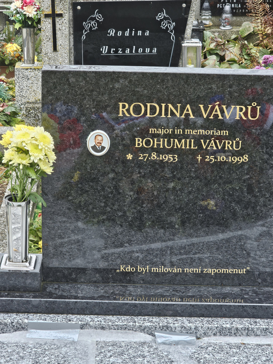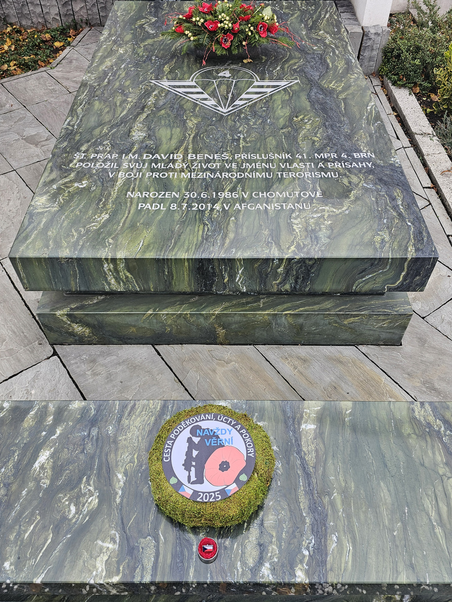 Na hřbitově v Choustníku odpočívá major Ing. Rostislav Samec. Kraj je nasycený vlhkostí, listí tmavne v trávě, vzduch je chladný. Na jeho náhrobku poutníci čtou slova, která v deštivém dni zní ještě hlouběji: „Jediné, co bude důležité, až odejdeme, budou stopy lásky, které tu po nás zůstanou.“ Nad těmito slovy se rozhostí ticho. A možná právě v něm je celá podstata této cesty. Poutníci přikládají vlaječku, svíčku a poutní věneček.