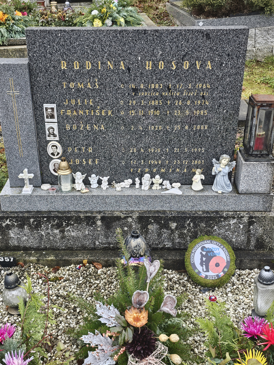 O několik kilometrů dál, v Dačicích, čeká další zastavení – u hrobu podporučík in memoriam Václava Martínka. Zatažené nebe a vlhké kamenné náhrobky podtrhují vážnost okamžiku. Cesta není jen o kilometrech, ale o přítomnosti – být tady, zastavit se, vzpomenout, dívat se do tváře časům, které už se nevrátí.
