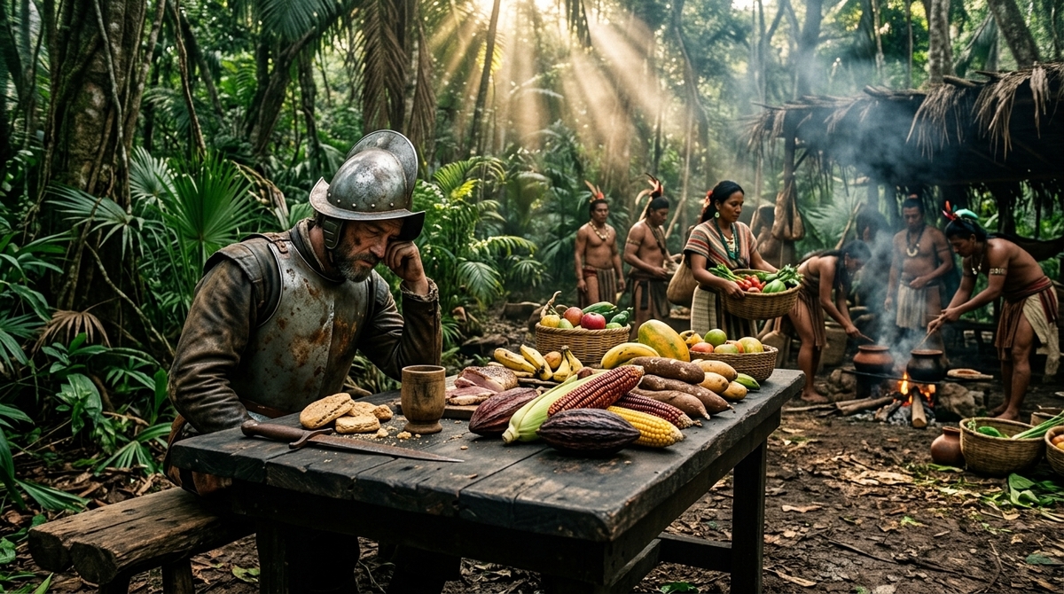 Bernal Díaz popisuje, jak conquistadoři zpočátku považovali rajčata za podezřelá – byla příliš křiklavá, rudá a neznámá. Avokádo se jim jevilo jako mastné, olejovité ovoce bez jasného účelu. Po první zkušenosti u nich chilli vyvolalo reakci, kterou Bernal diplomaticky popisuje: „Nebyli jsme na něj zvyklí, nechutnalo nám a šlo ven.“ Hlad je však nejlepší kuchař – a po několika týdnech cestování conquistadoři jedli všechno.