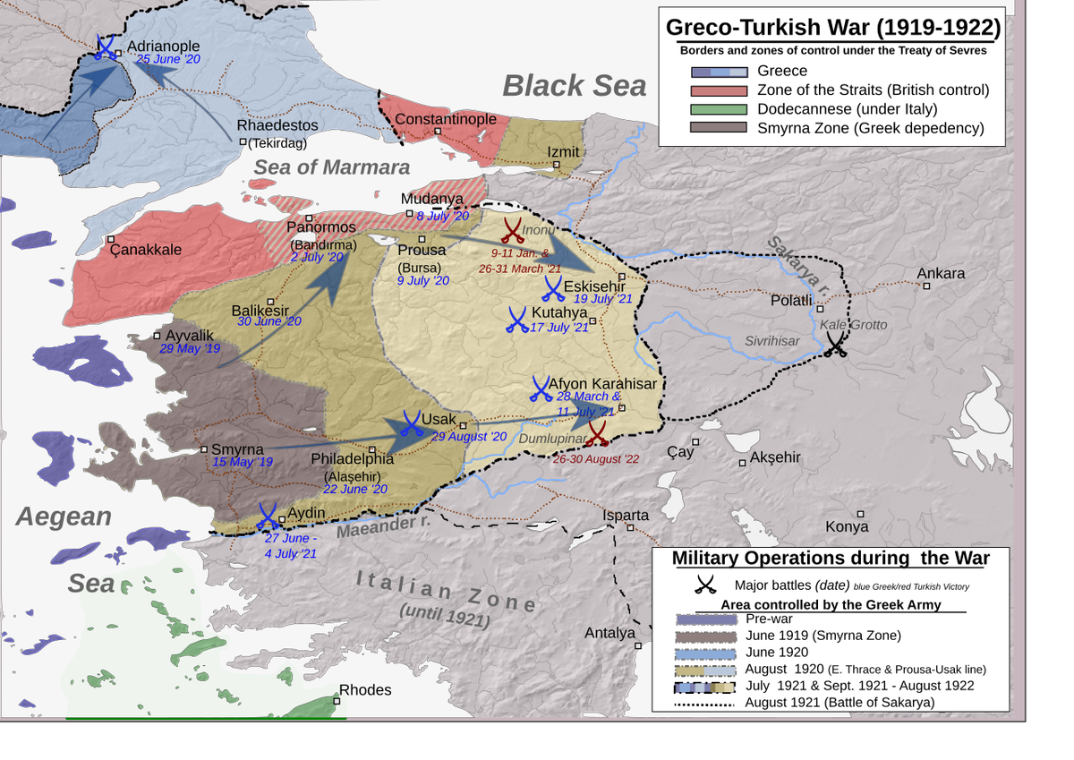 Foto: Mapka, znázorňující postup řeckých vojsk do tureckého (anatolského) vnitrozemí. Vlevo tmavě oblast s centrem ve Smyrně (Izmiru), která měla Řecku přímo připadnout, spolu s většinou turecké Thrákie, i podle sévreské smlouvy ze srpna 1920. Vpravo je znázorněn nejzazší postup Řeků a jejich porážka v bitvě na řece Sakarya v srpnu až září 1921. Červená barva značí oblast Úžin pod vrchní kontrolou Velké Británie. | Wikimedia Commons / Public domain