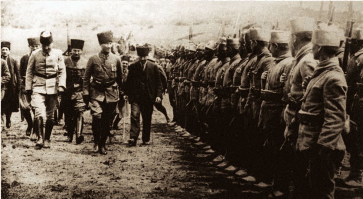 Foto: Mustafa Kemal Paša (později prezident Turecké republiky Atatürk) na inspekci jednotek turecké nacionalistické armády, červen 1922. Během několika málo dalších měsíců měla tato armáda vytlačit Řeky z Anatólie, a tím v podstatě i přimět velmoci Dohody, aby ustoupily od řady podmínek, uvalených předtím ještě na Osmanskou říši. | Wikimedia Commons / Public domain
