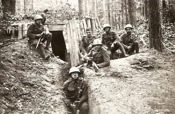 Foto: Kulometný dřevo-zemní polní objekt s čs. vojáky za mobilizace na Slovensko- Maďarské hranici (archiv Roman Kubeček)