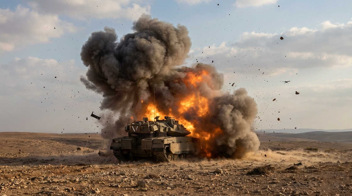 Foto: Výbuch tanku Merkava po útoku dronem (ilustrační foto) | ChatGPT / Open AI