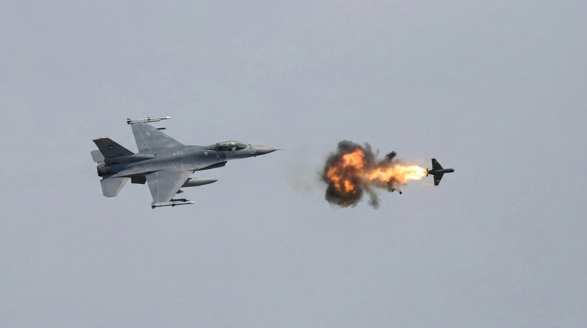 A právě tady video funguje jako silný signál: ukazuje, že F-16AM je schopný takový cíl zachytit — ale zároveň připomíná, že i úspěšný zásah může být nebezpečný.