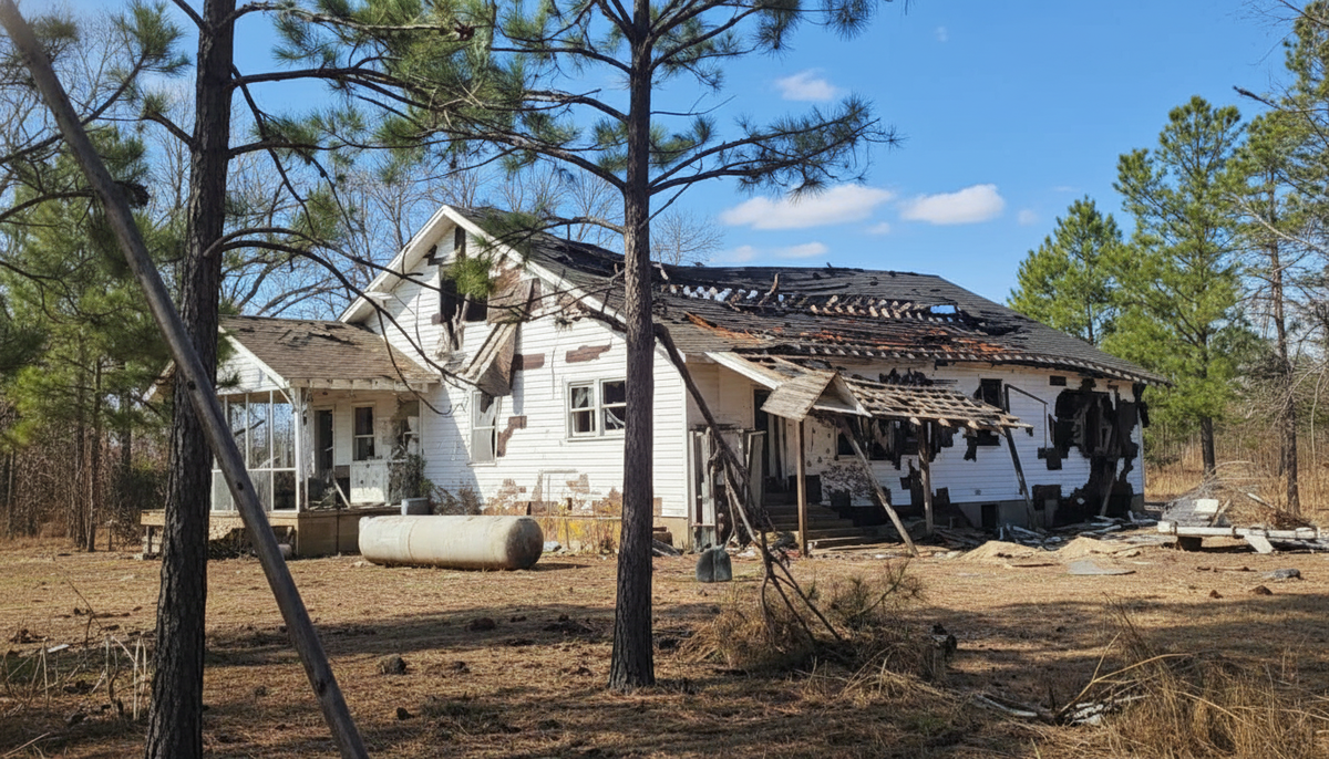 Foto: Dům po zásahu tlakové vlny způsobené výbuchem bomby Mk6 na dvorku v Mars Bluff (kolorováno) | Wikimedia Commons / Public domain